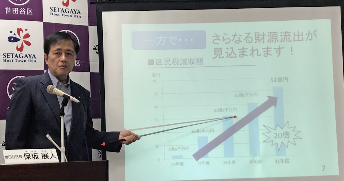東京都世田谷区の保坂展人区長は25日の記者会見で、ふるさと納税に伴う東京23区からの税金の流出に関し「税制そのものを崩壊させる段階に入ってきている」と述べ、批判した。寄付金集めに成功している多くの自治体では、地方交付税との「二重取り」になっているとも指摘した。制度について「疑問がある。抜本的な改革を」と訴えた。