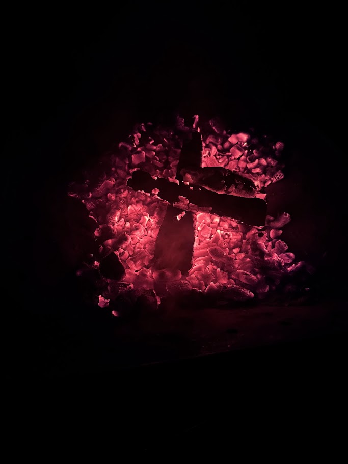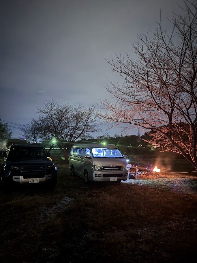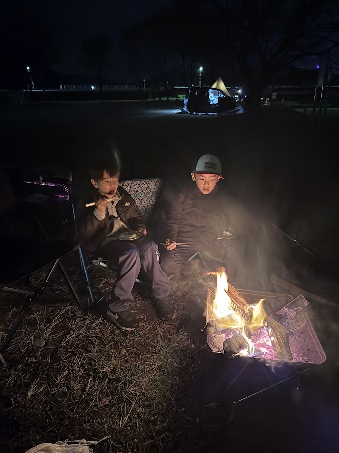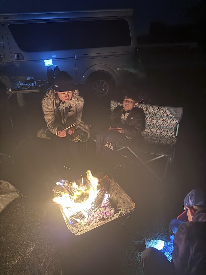 燃える焚火を見つつゆっくりしていると妻の携帯が鳴る。23時。