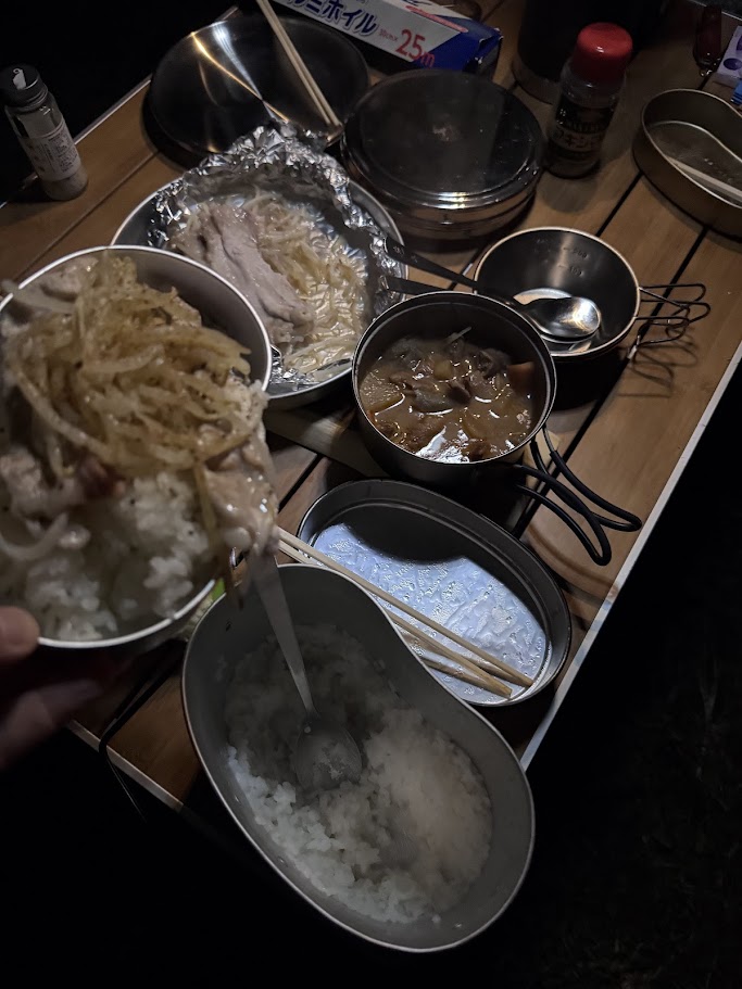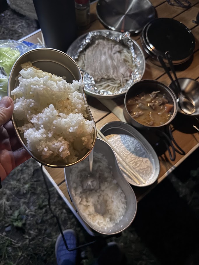 明日は県民の日で休みにつき、二男坊が友達つれてキャンプ。便乗して夕飯を飯盒でいただく。