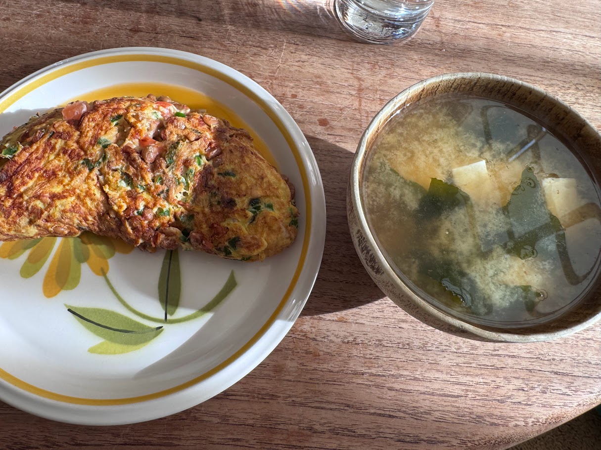 お風呂入ってから朝食。納豆オムレツが一番だ。