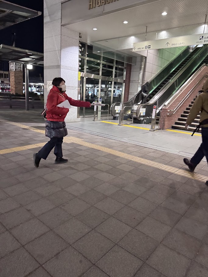 寒すぎる中でみんなで駅頭をがんばる。
