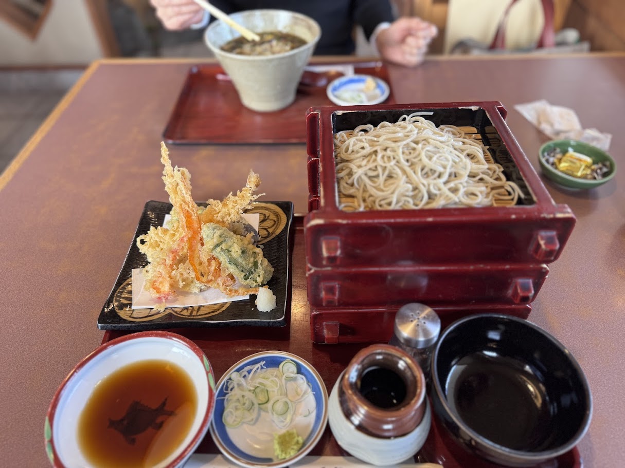 奥様が長男坊の高校からちょうど戻ってくるということで合流してお昼を食べる。お蕎麦。