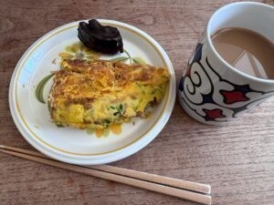 朝食、ドーナツをひとかけらだけ食べる。美味しい。