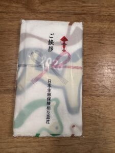 お年賀。結局、タオルが一番助かる。しかもこれはかわいい。タオル自体に社名をプリントしてもいいと思いますよ。日本生命さん。