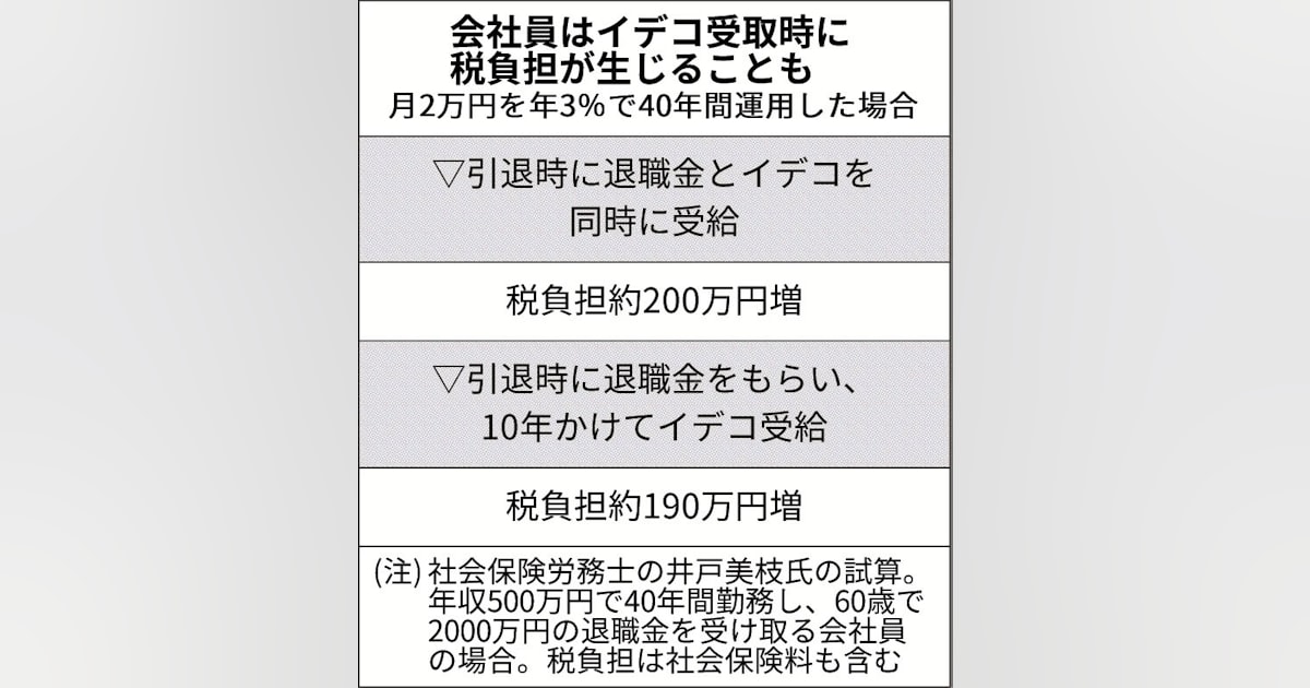 老後資産形成への関心が高まるなか、個人型確定拠出年金(イデコ)の加入者が増えている。2年後には全会社員が加入できるようになり一段の普及が見込まれる。ただ自営業者らと異なり、退職金の手厚い会社員は思わぬ税負担が将来生じる可能性があることはあまり知られていない。イデコは税優遇が人気の理由だけに周知が課題になる。